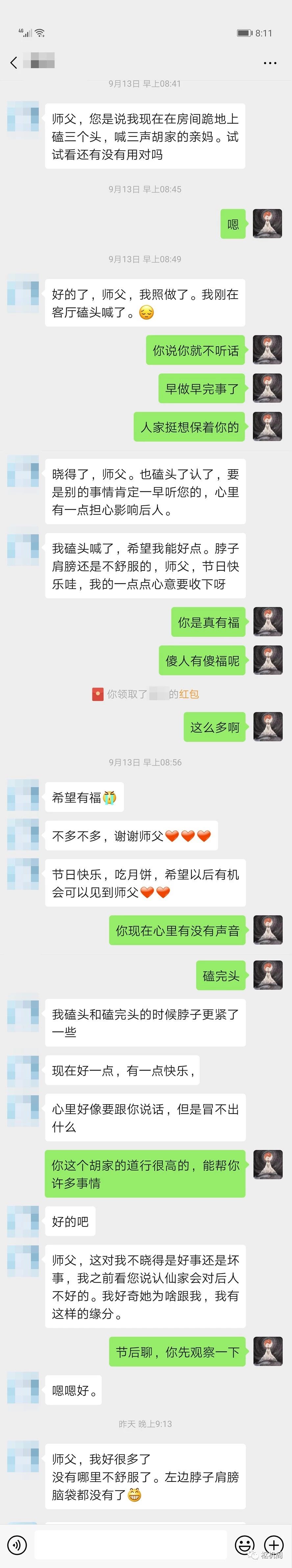 不是所有的精灵都配称为仙家,也不是所有的仙家都可以称之为正仙。这个仙家不是我聊天记录捧她厉害,是真的很有道行。要知道她其实在这个小姑娘身边许久了,从来就没磨过人。短短一两天的时间,能让小姑娘有这么大的生理反应,已是难得。要看一个仙家是不是正仙,还要看他是不是通人情,懂人理。有很多都是才会说人话,不讲道理的混蛋,这种也就算不上仙家,更谈不得正仙。像是聊天记录里这一位,说到做到,虽然是闹了小姑娘几天,可我也知道她也只是教训教训小姑娘,让她开开窍。以我查来的她的道行,如果真的是恶意伤人,其人是很难活下来的。正仙都是言出必行的,从最后的结果来看他没有让我们失望。